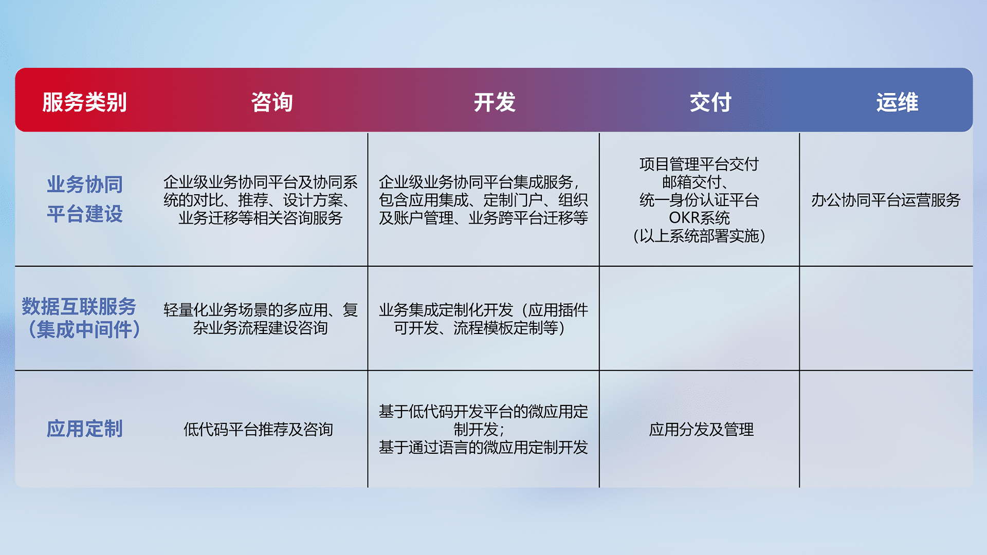 针对钉钉、、、企微、、IDaas等平台级产品提供产品的规划、、、、方案、、、交付、、、、定制化开发等服务,,实现如统一协同办公、、、智能客户服务、、、、混合会议管理、、、、智能数据查询、、、、等业务场景,,,实现数字化转型。。